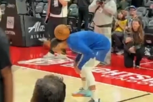 勇士背靠背挑战开拓者,赛前在球迷的呼喊声中,库里和助教玩足球传球,之后三分命中。