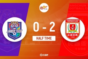 伤停补时4分钟。上半场比赛结束,天津津门虎0-2长春亚泰。