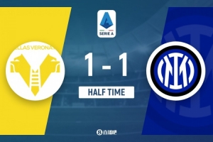 伤停补时2分钟。上半场比赛结束,国际米兰1-1维罗纳。