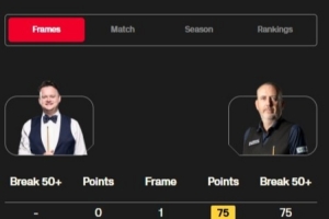 马克-威廉姆斯打出一杆破百(127)和五杆50+(75、73、56、68、69),肖恩·墨菲打出两杆50+(55、69)。
