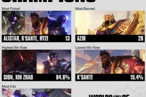 体育资讯10月20日讯 世界赛至今英雄BP数据如下: